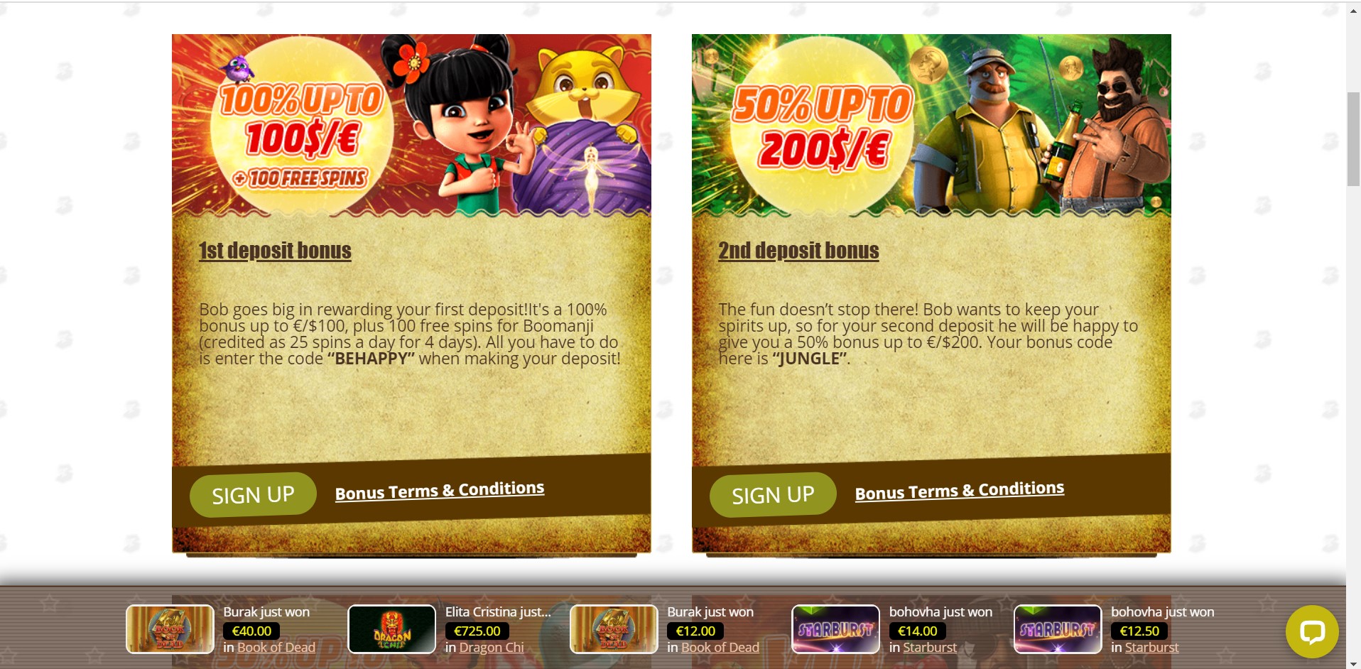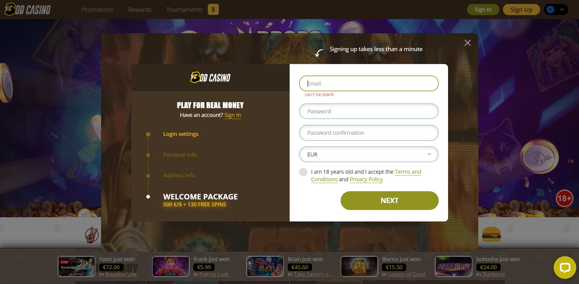 Min deposit is EUR 10. The bonus received when the Player makes his/her first deposit to the Website has a wagering requirement of forty (40) times the sum of the received deposit + bonus.